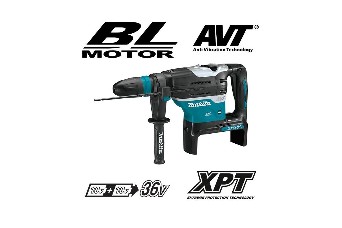 Аккумуляторный перфоратор Makita DHR400ZK с большой силой удара (8 Дж) справляется с крепким материалом. Инструмент оснащен антивибрационной технологией (AVT) для сокращения воздействия на здоровье. Защита о пыли и влаги увеличивает срок пользования прибором. Модель работает от двух аккумуляторов напряжением по 18 В (приобретаются дополнительно).