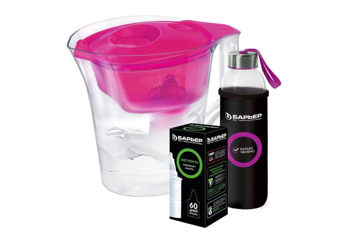 Лимитированная серия: фильтр-кувшин в сочном ягодном оттенке в комплекте со стильной бутылочкой и кассетой БАРЬЕР Жесткость. БАРЬЕР Аура подойдет даже для большой семьи. Удобный клапан на крышке автоматически открывается под напором воды, а откидной носик защищает воду от попадания пыли. В комплекте с кувшином кассета БАРЬЕР Жесткость, с которой вы забудете, что такое накипь в чайнике. Резьбовое крепление кассеты исключает попадание неочищенной воды в отфильтрованную. Одна кассета БАРЬЕР способна заменить несколько сотен пластиковых бутылок. А чтобы чистая вода была всегда с вами, в комплекте стильная стеклянная бутылочка. Кувшин и бутылочку можно мыть в посудомоечной машине. По окончании ресурса кассету можно сдать на переработку.